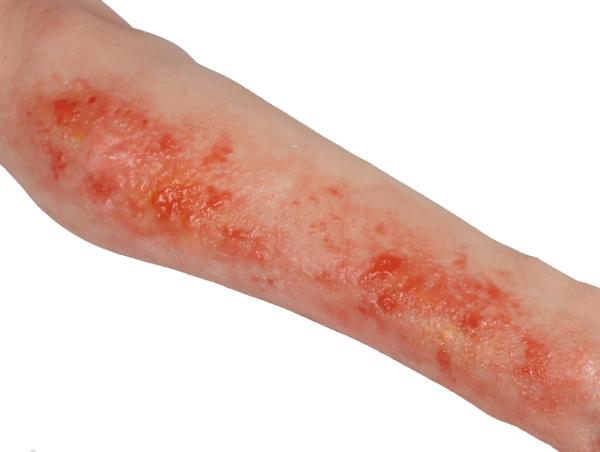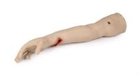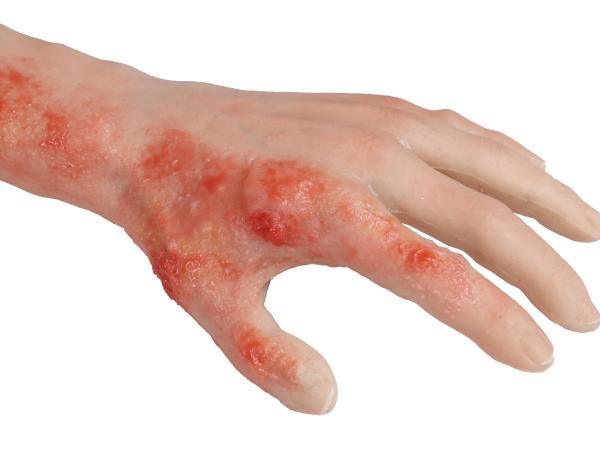 Diese Abformung eines echten menschlichen Arms in Lebensgröße ist aus hautähnlichem Material hergestellt und ist beweglich. Der Trainer stellt eine Verbrennung 2. Grades am Arm dar, die großflächige Verbrennung kann desinfiziert und verbunden werden.
